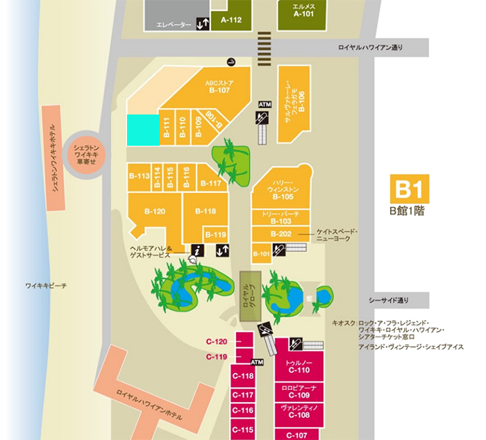 住所 | 2233 Kalakaua Ave, #B110F Honolulu, HI 96815 ロイヤル・ハワイアン・センターB館1F |