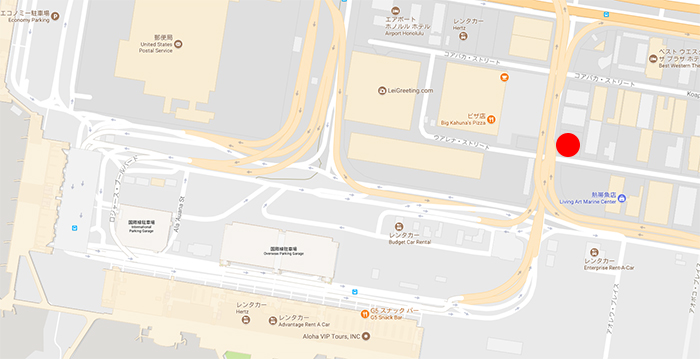 場所は、ダニエル・K・イノウエ国際空港近くの、Ualena St(ウアレナ・ストリート)と、空港高架橋下のPaiea St(パイエア・ストリート)の交差点の北東角です。