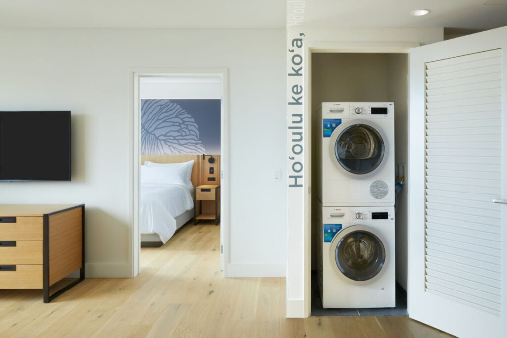 定員5名、キングサイズベッド1台+ダブルソファーベッド1台、フルキッチン、洗濯機・乾燥機(レジデンス層は全室完備)、バスタブあり、トイレ(TOTOウォシュレット)。